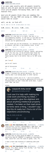 I didn’t think it needed to be said because it’s not relevant to this discussion, but: the majority of AI sucks on all fronts. It’s bad for intellectual property, it’s bad for the environment, it’s bad for privacy, it’s bad for people’s brains, and it’s bad at what it’s used for.