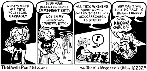 I feel like the hippie represents part of her fan base, wishing for her to stop highlighting politics in her comics. I think this is her addressing that part of the fan base.
