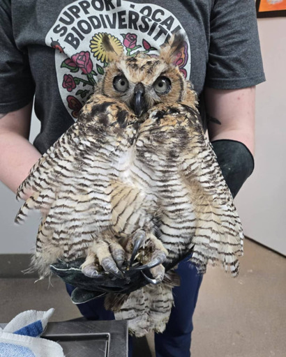 It’s in the eyes! Typically, Great Horned Owls have piercing yellow peepers, but these are a pale green. It was the first thing our clinic team noticed when this patient arrived, dehydrated and suffering from neurological damage associated with secondary rodenticide poisoning.