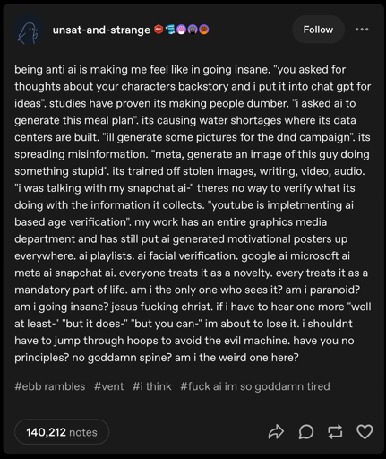 being anti-AI is making me feel like I’m going insane. “You asked for thoughts about your character’s backstory and I put it into ChatGPT for ideas.” Studies have proven it’s making people dumber. “I asked AI to generate this meal plan.” It’s causing water shortages where its data centers are built. “I’ll generate some pictures for the DnD campaign.” It’s spreading misinformation. “Meta, generate an image of this guy doing something stupid.” It’s trained off stolen images, writing, video, audio. “I was talking with my Snapchat AI.” There’s no way to verify what it’s doing with the information it collects. “YouTube is implementing AI-based age verification.” My work has an entire graphics media department and has still put AI-generated motivational posters up everywhere. AI playlists. AI facial verification. Google AI. Microsoft AI. Meta AI. Snapchat AI.