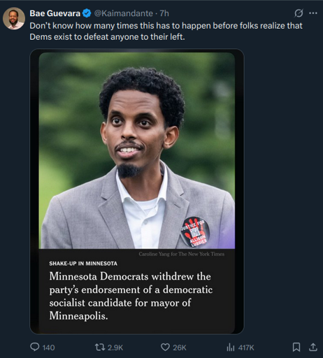 But I’ve been seeing disappointing behaviors from the Dems with that lately. Not just in New York and Maine, but also in Minnesota with how the Dems revoked their endorsement of democratic socialist Omar Fateh. Pathetic.