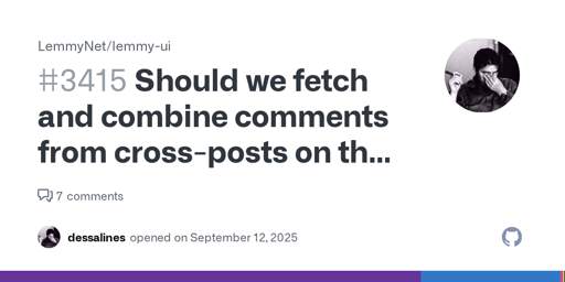 Dessalines@lemmy.ml to Lemmy@lemmy.mlEnglish · 20 days agoLemmy community feedback: Should we fetch and combine comments from cross-posts on the post screen? · Issue #3415 · LemmyNet/lemmy-uigithub.comexternal-linkmessage-square69linkfedilinkarrow-up1114