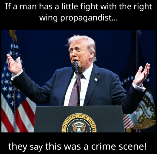 minus-squareOldManBOMBIN@lemmy.worldlinkfedilinkarrow-up8·1 month agoOk, so I did some research. A few days ago, Trump said "If a man has a little fight with the wife, they say this was a crime scene” when speaking about crime rates in DC.