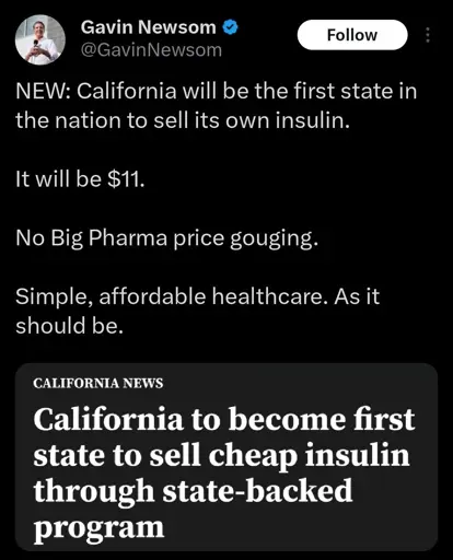 Florencia (she/her)@lemmy.blahaj.zone to Progressive Politics@lemmy.worldEnglish · 9 days agoCalifornia to become first state to sell cheap insulin through state-backed programlemmy.blahaj.zoneimagemessage-square243linkfedilinkarrow-up11.33Kfile-text