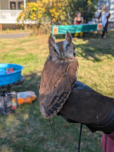 The real fun for me though happened by coincidence. When I got there, they had the red tailed hawk out, but shortly after, someone came out with our red mirror Screech, Harry. She came by and was talking about how she guy assigned the job somewhat last minute so had looked up a bunch of owl facts the night before.