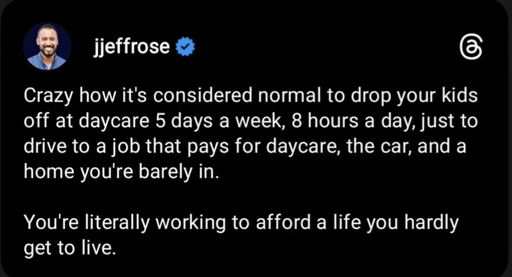 It’s easy to blame the individuals, and certainly it’s in their best interests to work on their issues and goals and priorities any way they can. But we on Lemmy know that there are systemic financial and cultural forces constantly pushing people into the rat race lifestyle and telling them that earn + consume + daycare is the life that a good american strives for.