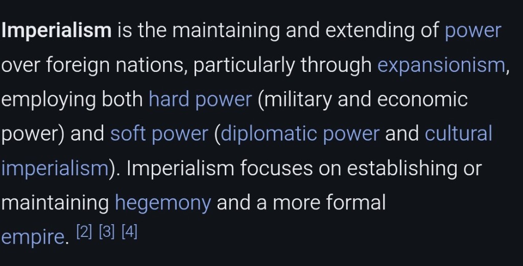 I posted two very common definitions above and it’s imperialism because it fits the definition. It shouldn’t matter if you support it, it’s not a reason to not consider it imperialism.